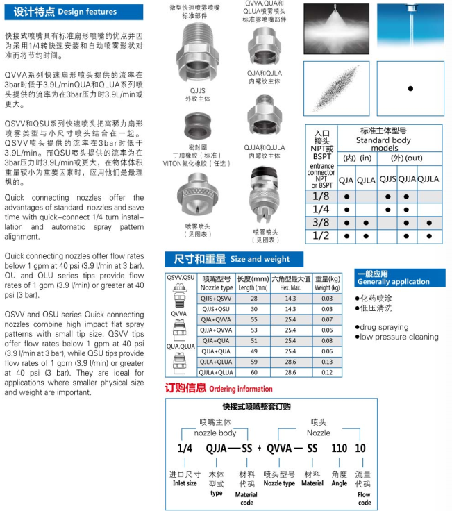 The QSVV and QSU series rapid spray heads combine high-strength fan-shaped spray types with small size spray heads. The flow rate provided by the QSVV nozzle is less than 3.9l/min at 3bar. The flow rate provided by the QSU nozzle is 3.9 l/min or more at a pressure of 3 bar. When the volume and weight of the object are important factors, it is ideal to apply them.
